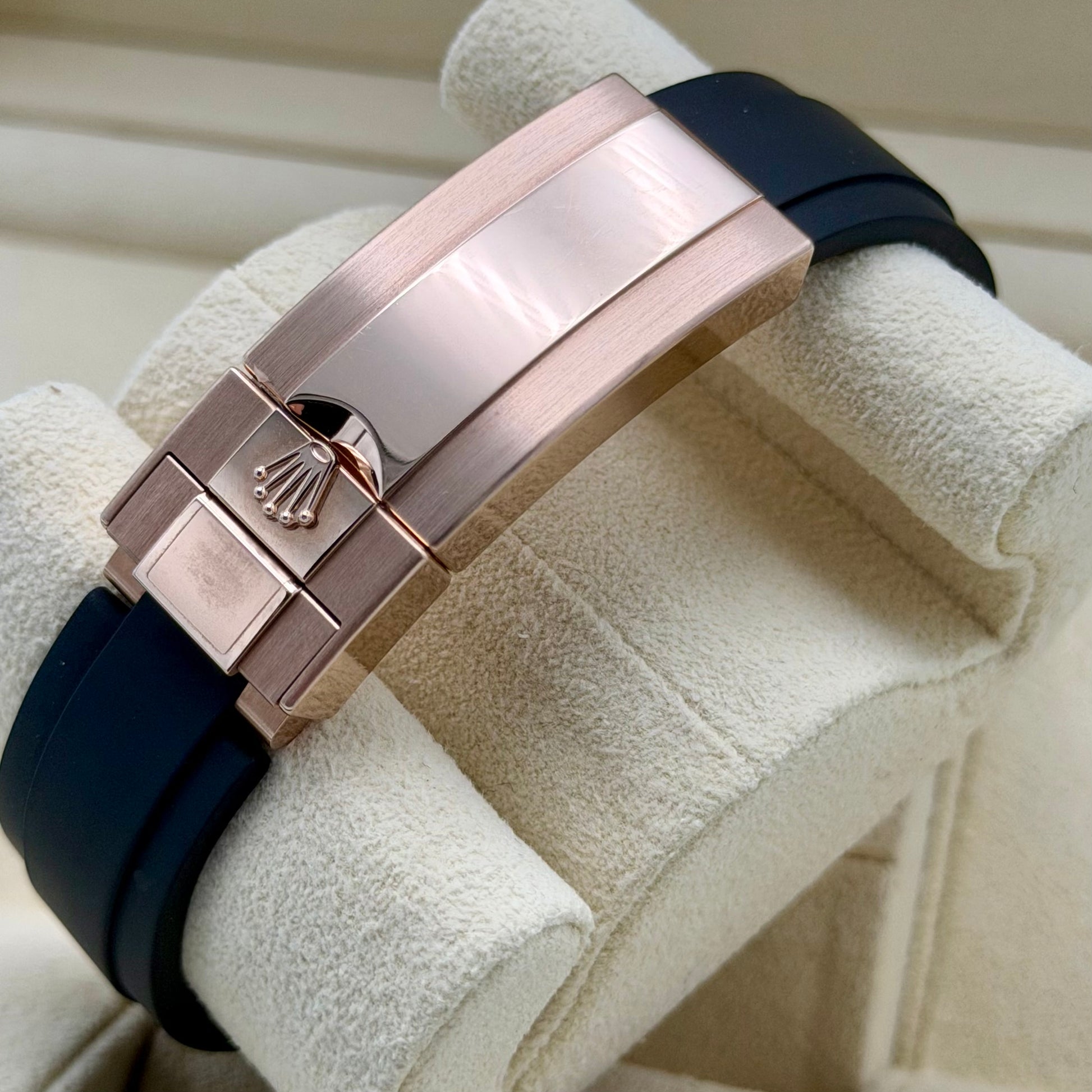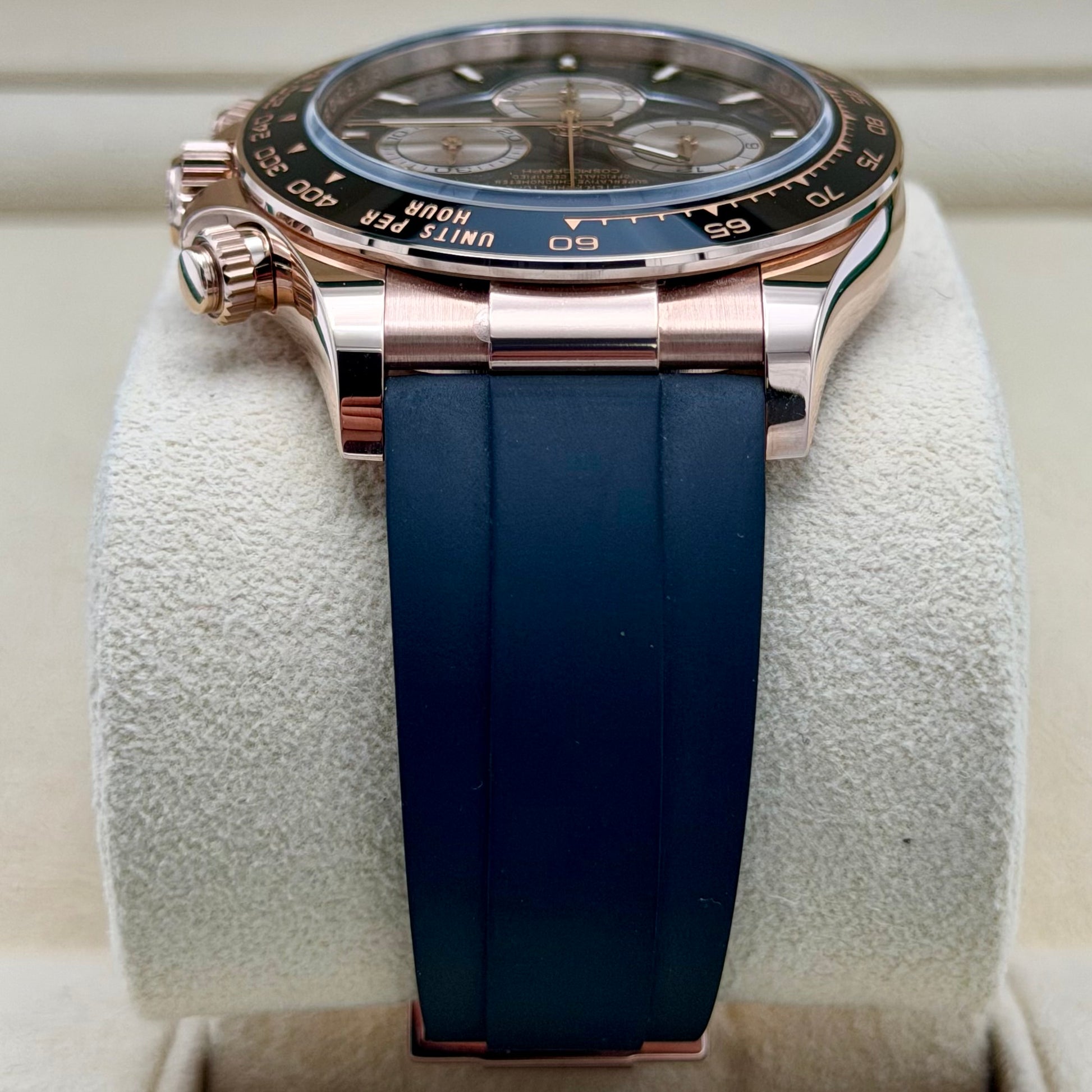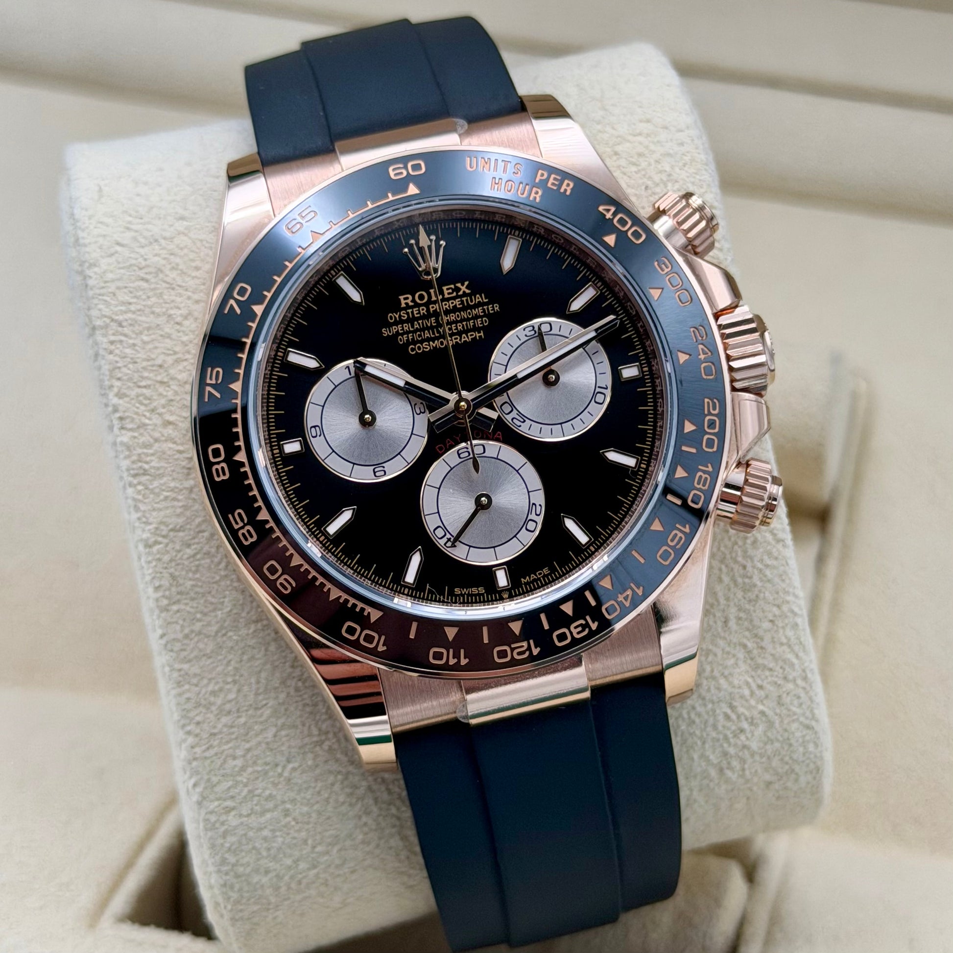 Immaculate condition Rolex Daytona in rose gold on an Oysterflex strap with the bright black dial.